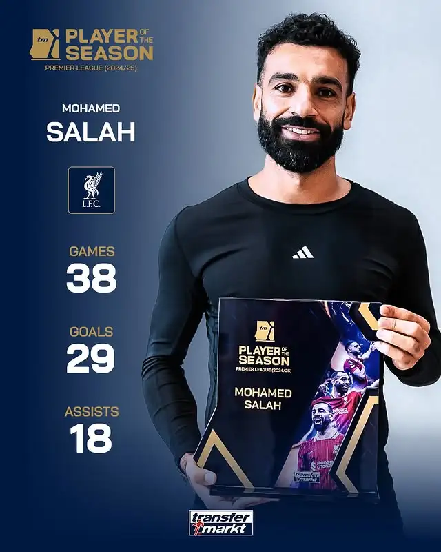 在斯洛特的执教下,萨拉赫上赛季的出色表现为利物浦赢得英超冠军发挥了决定性作用,他在上赛季英超联赛中的数据为38场29球18次助攻。德转英区内容主管Stefan Bienkowski表示:“毫无疑问,利物浦是上赛季英超最好的球队,萨拉赫的数据本身已经足够说明一切,他拥有惊人的加速能力和盘带技巧,他也是关键先生,连对手球迷也不得不钦佩。英超有许多世界级的进攻球员,但上赛季没有人能接近这位埃及国脚。尽管已经年满33岁,他依然没有任何下滑迹象。”